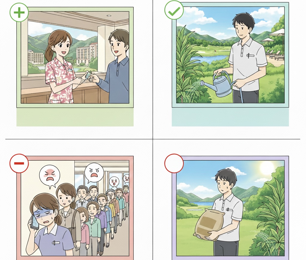 自分を変えたくて挑戦したいなら「接客」、今の生活から離れてリセットしたいなら「裏方」を選ぶのが、最も満足度の高いリゾバ生活に繋がります。